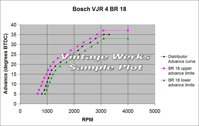 With revisions to the 1192cc beetle engine in July 1954, VW introduced the Bosch VJU 4 BR 8 distributor which is the one commonly associated with the 36hp powered beetles beginning with chassis No. 1-0 702 742 and continuing through the end of the decade.  This distributor replaced the earlier BR 2 and BR 3 units also utilizing dual advance (mechanical and vacuum) to achieve the desired performance curve but with less total advance and with slightly different static timing than its predecessors.  The BR 8 provides approximately 8.5 degrees total advance at 1600 rpm as measured at the distributor, 17 degrees at 3200 rpm at the crankshaft.